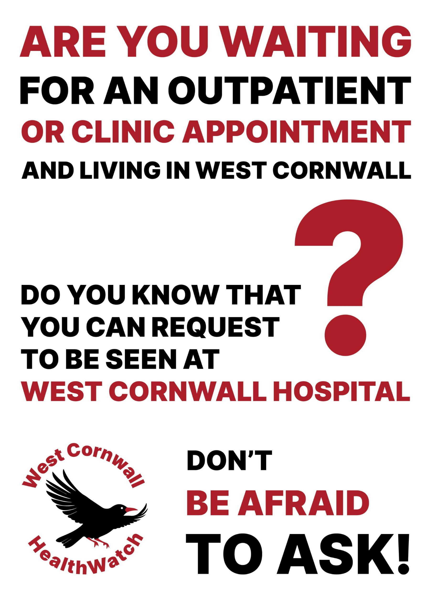 Where possible, dependent on staffing capacity, the booking office may be able to offer a clinic appointment at West Cornwall Hospital to save you travelling to Treliske. If this is something that would be of benefit to you, when a doctor feels a referral is necessary, you can ask them to request a West Cornwall appointment.
